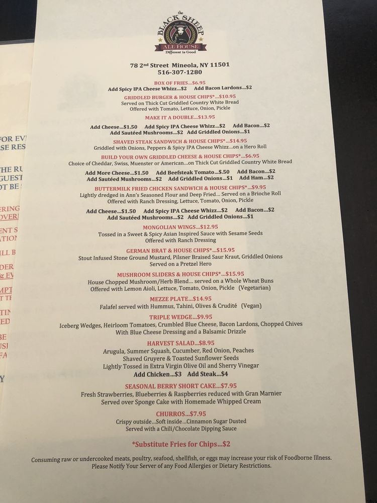 Introducing The Black Sheep Ale House, a cozy beer garden and bar located in Mineola, NY. With a welcoming ambiance and friendly staff, this spot is perfect for a casual drink or watching your favorite team play. The outdoor seating area is heated, covered, and offers a variety of entertainment options like board games, darts, and pool. The beer selection is diverse, with hard-to-find options and a full bar for any preference. The food menu features delicious pub fare, including Ike’s burgers, chicken empanadas, and a standout manwich. The owners are generous and community-minded, often hosting events for local causes. Whether you're a beer connoisseur or just looking for a relaxing spot to unwind, The Black Sheep Ale House is worth a visit.